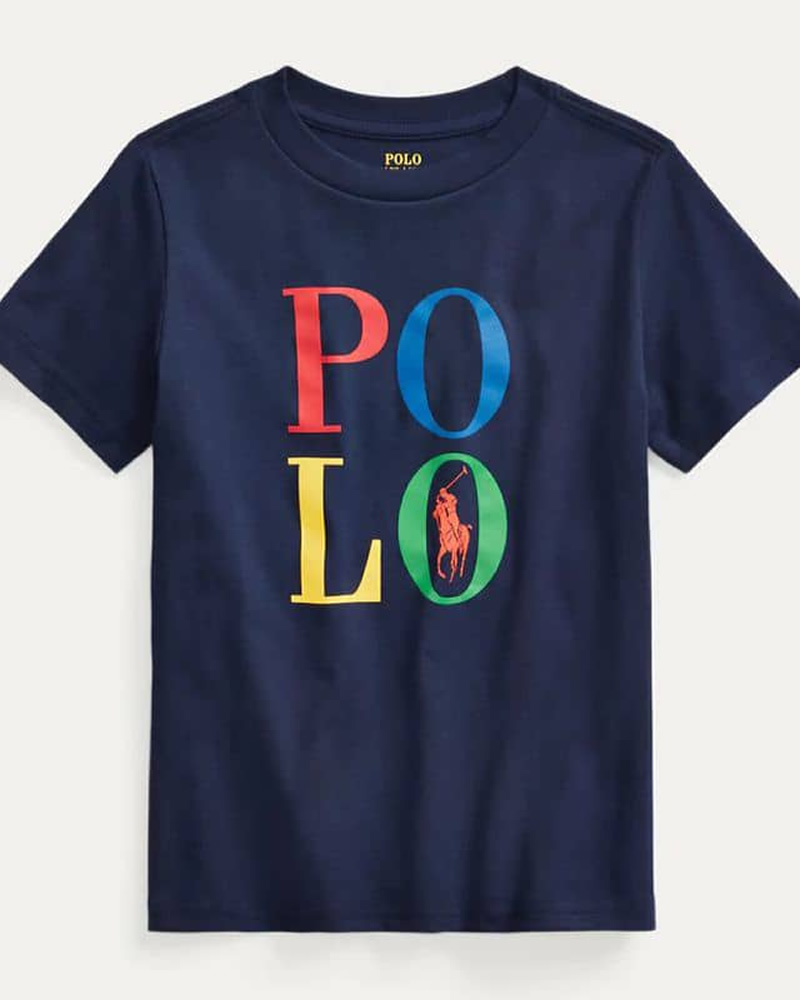 Polo Ralph Lauren Logo Cotton Jersey T-Shirt in Navy Blue with a Colorful “Polo” Logo Graphic on the Front